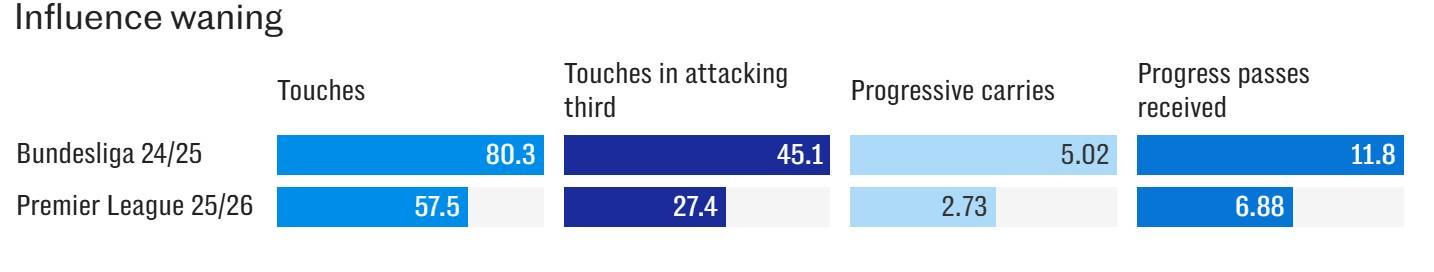維爾茨的場(chǎng)均觸球數(shù)從上賽季的80次暴跌至本賽季英超的58次。在進(jìn)攻區(qū)域,這一下降甚至更為明顯:他在英超場(chǎng)均最終三區(qū)觸球27次,而去年在德國(guó)時(shí)是場(chǎng)均45次。