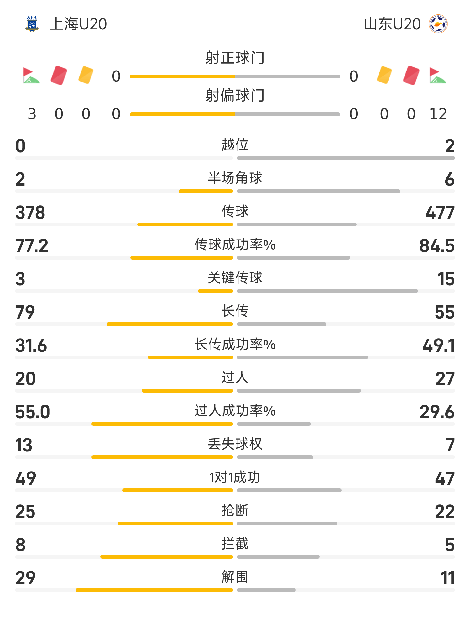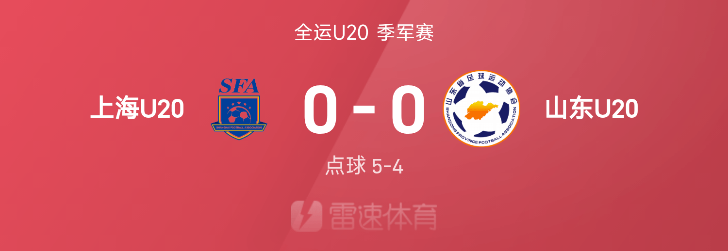 雷速體育11月12日訊 第十五屆全運(yùn)會(huì)U20男足季軍賽,上海U20對(duì)戰(zhàn)山東U20。上半場(chǎng),杜月徵造險(xiǎn),上海隊(duì)門(mén)將劉浩然屢次做出撲救。下半場(chǎng),雙方互有攻守,但均未能取得進(jìn)球。90分鐘戰(zhàn)罷,雙方互交白卷,比賽進(jìn)入點(diǎn)球大戰(zhàn)。點(diǎn)球大戰(zhàn),上海U20隊(duì)全部罰中,山東U20隊(duì)宮睿聰罰丟一球,上海U20隊(duì)(0-0)(點(diǎn)球5-4)戰(zhàn)勝山東U20隊(duì)奪得銅牌。